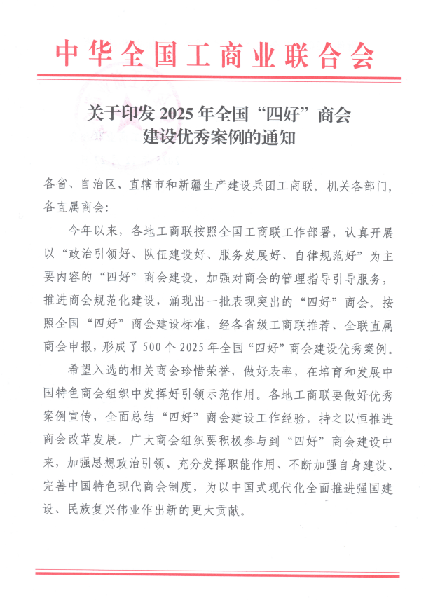 日前,中华全国工商业联合会公布了2025年全国“四好”商会建设优秀案例名单,我会申报的“以总部基地建设与招商实践 激活汽车产业高质量发展新动能”案例成功入选,从全国500个优秀案例中脱颖而出,标志着我会在规范化建设与服务创新方面获得国家级认可。